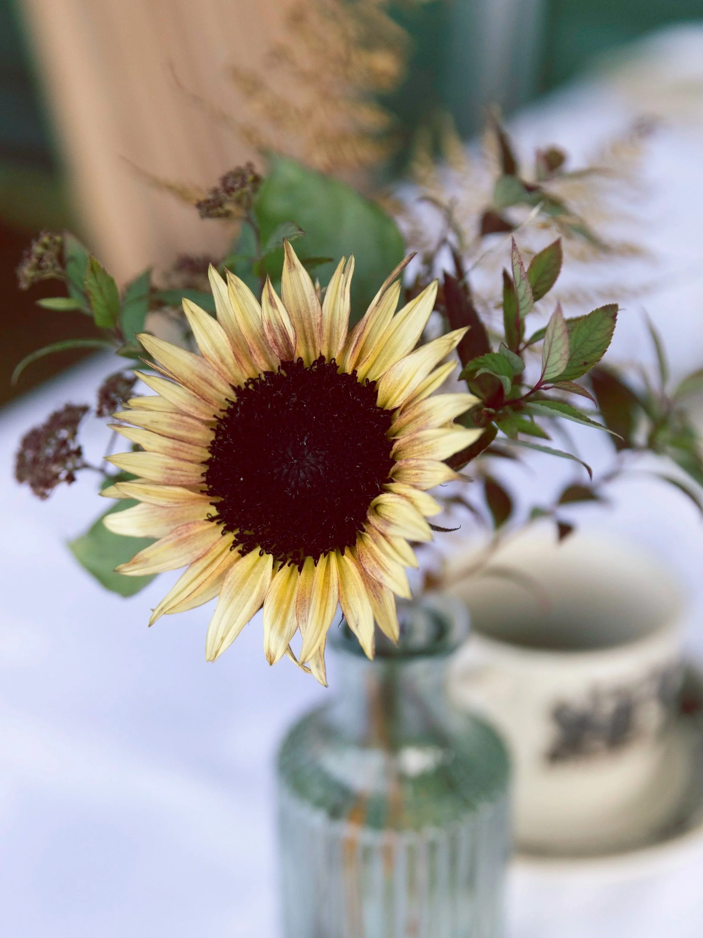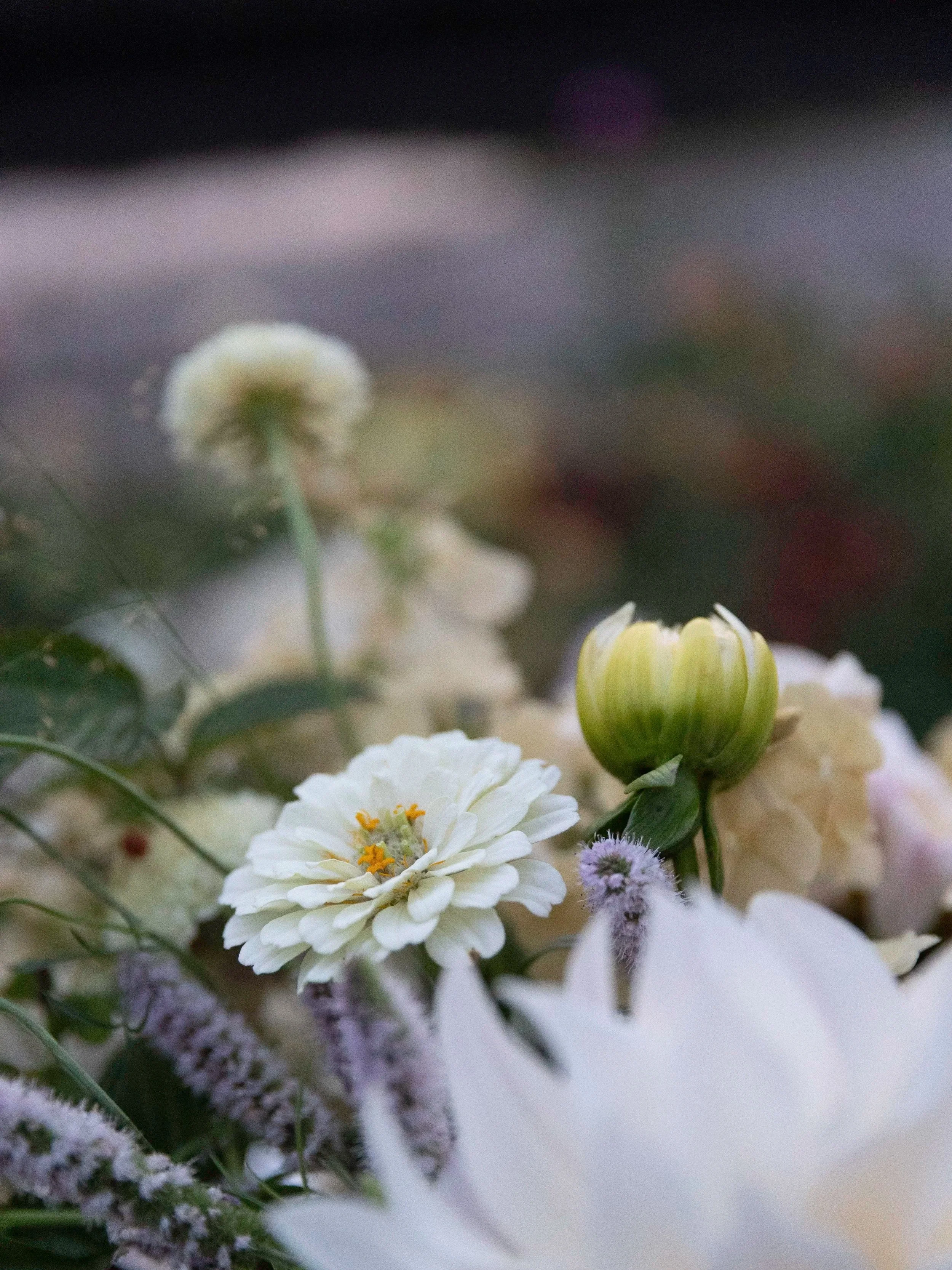 Håndkuratert og helhetlige borddekorasjoner hvor blomster og vaser er tilpasset bordene, annen dekorasjon og omgivelsene